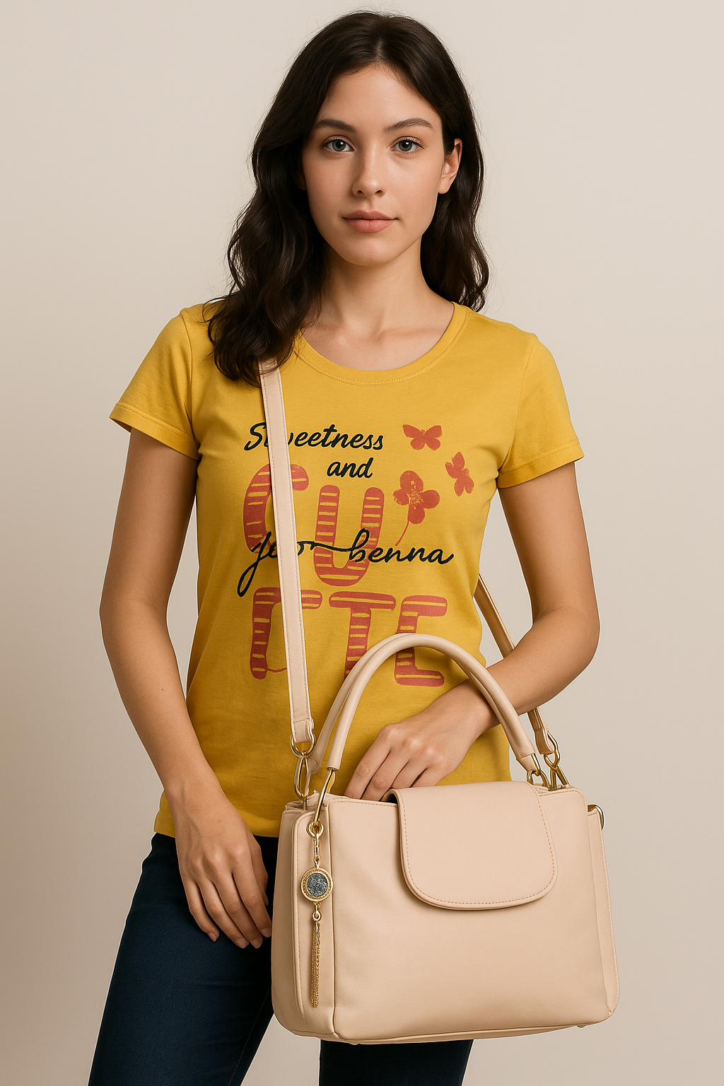 Main Handbag: A structured tote with soft handles, flap-over top, and luxe gold detailing—ideal for work, brunch, or everyday errands.